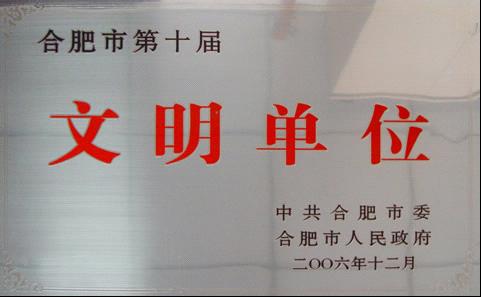 去年以来,公司深入学习贯彻党的十六大精神,以“三个代表”重要思想为指导,在公司党委的正确领导下,广泛扎实开展群众性文明创建活动,经全体员工共同努力,公司在精神及物质文明方面均取得了丰硕成果,并于2006年12月被合肥市委、市政府授予“合肥市第十届文明单位”称号。