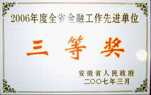 2007年3月22日,安徽省金融工作会议在合肥市稻香楼宾馆召开。我公司在此次会议上荣获安徽省政府通报表彰,并被授予“2006年度全省金融工作先进单位三等奖”奖励。