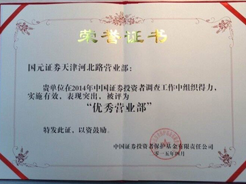 在7月召开的中国证券投资者保护基金公司业务工作会议上,北京分公司辖区天津河北路证券营业部受到中国投保基金公司的表彰并颁发了荣誉证书:鉴于国元证券天津河北路营业部,“在2014年中国证券投资者调查工作中组织得力,实施有效,表现突出,被评为优秀营业部”,为公司赢得了荣誉。