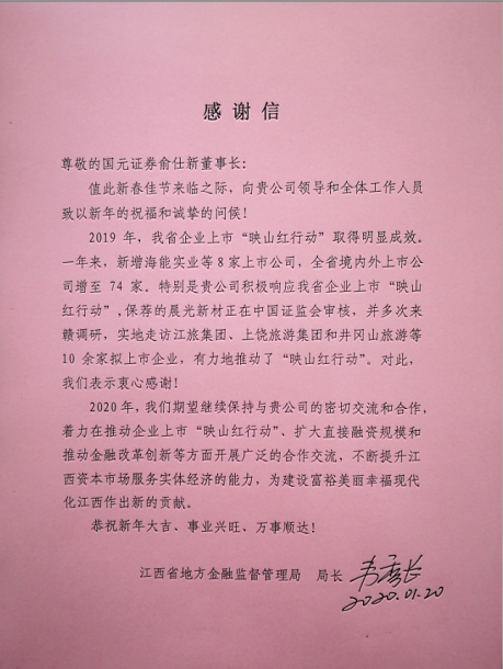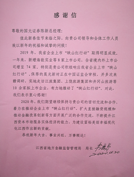 日前,江西省地方金融监督管理局发来对公司俞仕新董事长和陈新总裁的感谢信。感谢俞董事长和陈新总裁在助力江西“映山红行动”等方面做出的积极贡献。感谢信表示,公司多次来赣调研,实地走访拟上市企业,有力地推动了金融改革创新等方面的工作,服务于实体经济,为建设富裕美好幸福现代化江西作出了新的贡献。