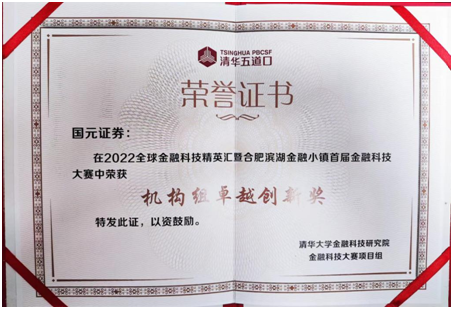 近期,在“2022全国双创周”期间,由清华大学金融科技研究院作为学术指导单位的“全球金融科技精英汇暨合肥滨湖金融小镇首届金融科技大赛”决赛圆满落下帷幕,国元证券荣获机构组卓越创新奖。
