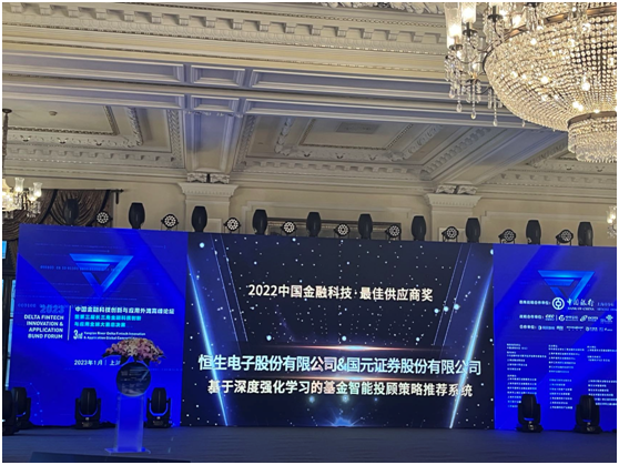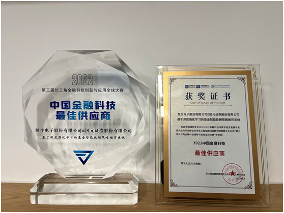 1月12日,长三角金融科技创新与应用全球大赛总决赛公布获奖名单,由国元证券和恒生电子联合申报的研究课题《基于深度强化学习的基金智能投顾策略推荐系统》,在参赛的457个项目中脱颖而出,获得“中国金融科技最佳供应商”奖。