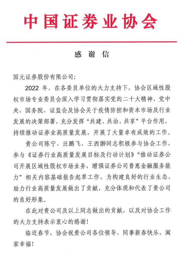 1月10日,公司收到中国证券业协会区域性股权市场专业委员会的感谢信,对公司大力支持协会工作致以谢意,并对创新金融部的陈宁、汪鹏飞和私人财富部的王西翀同志积极参与协会工作表示衷心的感谢。感谢信中提到,陈宁、汪鹏飞、王西翀同志参与的《证券行业高质量发展目标及行动计划》“推动证券公司开展区域性股权市场业务、增强证券公司普惠金融服务能力”相关内容基础报告起草工作,为构建良好的行业动态、助力行业高质量发展做出了贡献。