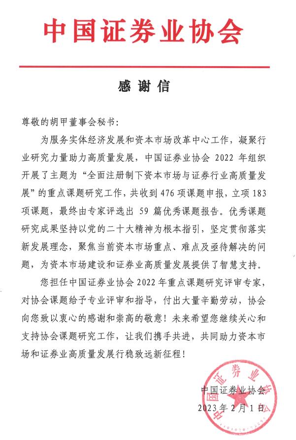 近日,公司收到中国证券业协会致董事会秘书胡甲同志的感谢信。2022年中国证券业协会组织开展了主题为“全面注册制下资本市场与证券行业高质量发展”的重点课题研究工作。胡甲同志担任中国证券业协会2022年重点课题研究评审专家,对协会课题给予专业评审和指导,付出大量辛勤劳动。