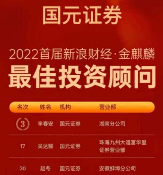 挖掘优秀投顾,共担时代使命,历经100天的激励角逐,首届“新浪财经·金麒麟”最佳投资顾问评选落下帷幕。比赛中,国元证券投资顾问充分展示了自己的专业能力,荣获佳绩,25名优秀投顾登榜各奖项,其中来自湖南分公司李春安荣获全国“最佳投资顾问”和“最佳投资收益奖”第三名。