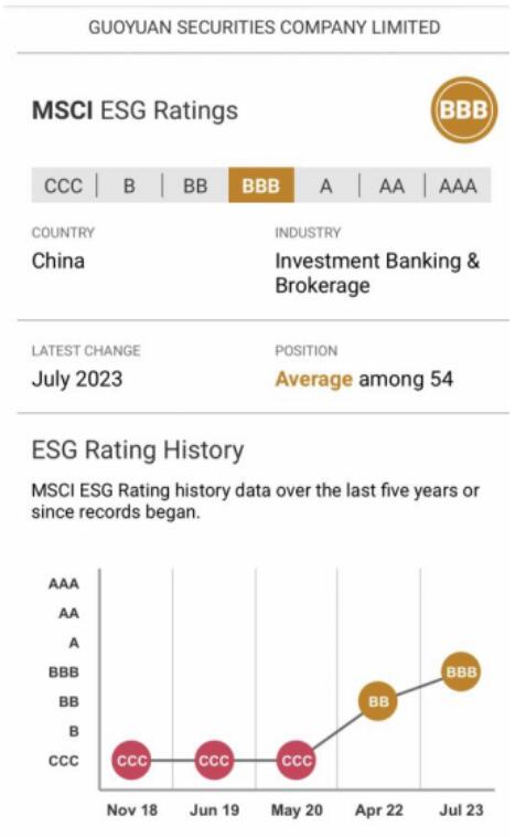 MSCI-ESG评级是当前市场普遍关注和认可度较高的ESG评级体系,也是全球投资组合经理中较多采用的投资标的。MSCI-ESG评级旨在衡量企业对与财务有关的长期ESG风险的应变能力,MSCI根据企业的ESG风险敞口和风险管理水平,给予企业“AAA”(最高)至“CCC”(最低)七个等级的评价,ESG评级越高,公司稳健经营、规范治理的水平越高。截至目前,国内上市券商MSCI-ESG评级结果最高为A级。 国元证券作为联合国责任投资原则组织(UNPRI)签署方、联合国全球契约组织(UNGC)会员及气候相关财务信息披露工作组(TCFD)的支持机构,始终坚守责任投资理念,持续深化可持续金融工作。2022年度被纳入恒生A股可持续发展企业基准指数成分股;连续十二年荣获安徽省人民政府服务地方实体经济发展评价最高等次;荣获证券时报颁发的中国上市公司ESG百强奖;荣获WIND ESG颁发的A股最佳实践奖(治理)。 下一步,国元证券将再接再厉,持续推动ESG治理水平提升,以自身实际行动助力经济社会可持续发展。