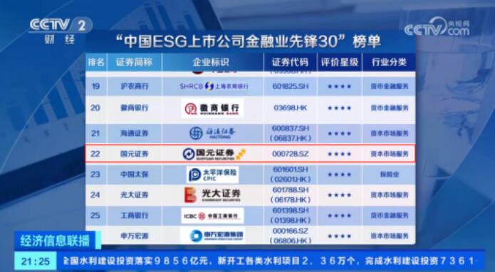 近日,中央广播电视总台(财经节目中心)发布《金融业ESG行动报告》,国元证券凭借在ESG方面的出色表现成功入选“中国ESG上市公司金融业先锋30”榜单,在银行、券商、保险等构成的中国上市金融行业中排名第22位。