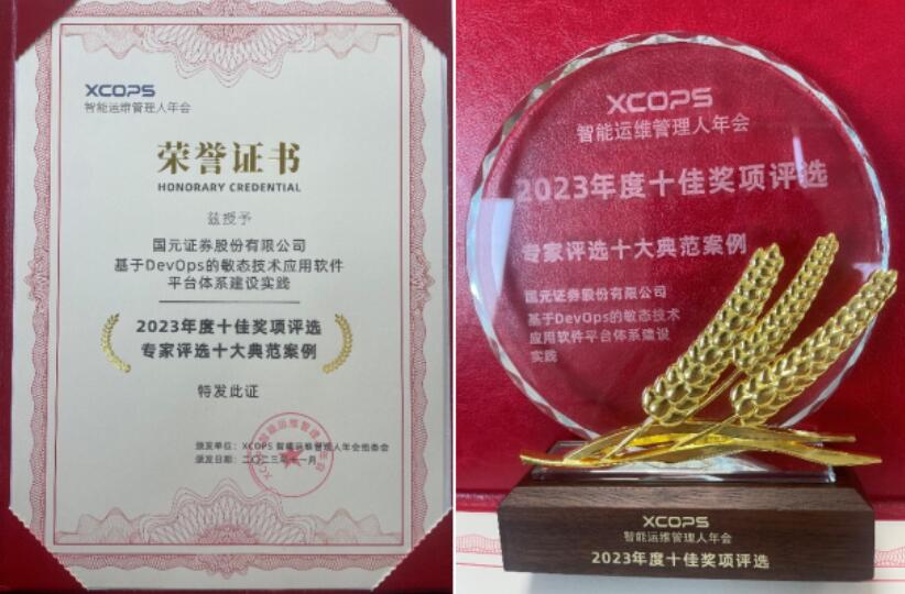2023年11月24日,由“Gdevops全球敏捷运维峰会”迭代升级的“XCOPS智能运维管理人年会”在广州举办,大会立足智能运维,深耕传统行业,为赋能行业数智化转型打造高层次、高质量的交流平台,全力打造行业标杆案例和最佳实践,赋能行业深度交流与发展。经过案例初筛、网络投票以及专家评审等环节,国元证券《基于DevOps的敏态技术应用软件平台体系建设实践》被评选为“2023年度专家评选十大典范案例”。