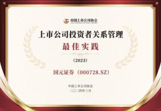 为助力上市公司提升投资者关系管理工作水平,打造上市公司质量提升与投资者回报增长相互促进的良性生态,中上协开展2023年“上市公司投资者关系管理最佳实践”活动,国元证券荣获“2023年度上市公司投资者关系管理最佳实践”荣誉。